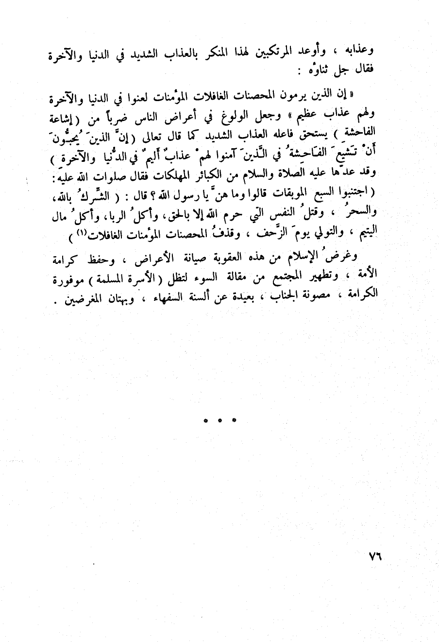 وعذابه، وأوعد المرتكبين لهذا المنكر بالعذاب الشديد في الدنيا والآخرة فقال جل ثناؤه: {إِنَّ الذين يَرْمُونَ المحصنات الغافلات المؤمنات لُعِنُواْ فِي الدنيا والآخرة وَلَهُمْ عَذَابٌ عَظِيمٌ} [النور: 23] وجعل الولوغ في أعراض الناس ضرباً من (إشاعة الفاحشةِ) يستحق فاعلة العذاب الشديد كما قال تعالى: {إِنَّ الذين يُحِبُّونَ أَن تَشِيعَ الفاحشة فِي الذين آمَنُواْ لَهُمْ عَذَابٌ أَلِيمٌ فِي الدنيا والآخرة} [النور: 19] وقد عدّها عَلَيْهِ الصَّلَاة وَالسَّلَام ُ من الكبائر المهلكات فقال صلوات الله عليه: اجتنبوا السبع الموبقات قالوا وما هنَّ يا رسول الله؟ قال: «الشِّركُ بالله، والسحرُ، وقتلُ النفس التي حرم الله إلا بالحق، وأكلُ الربا، وأكلُ مال اليتيم، والتولي يومَ الزَّحف، وقذفُ المحصنات المؤمنات الغافلات» .