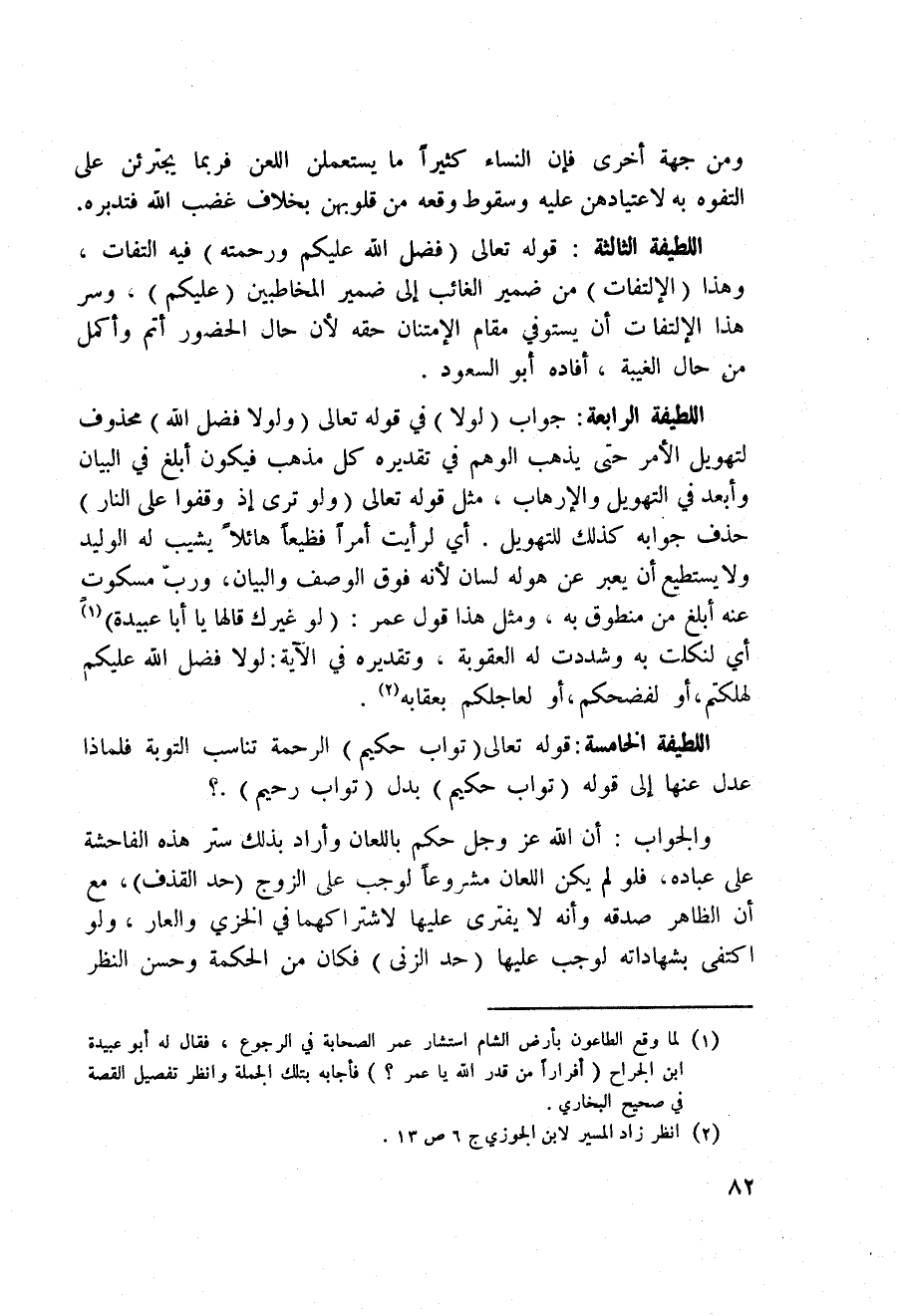 اللطيفة الثالثة: قوله تعالى: {فَضْلُ الله عَلَيْكُمْ وَرَحْمَتُهُ} فيه التفات، وهذا (الالتفات) من ضمير الغائب إلى ضمير المخاطبين (عليكم) ، وسر هذا الالتفات أنيستوفي مقام الامتنان حقه لأن حال الحضور أتم وأكمل من حال الغيبة، أفاده أبو السعود.