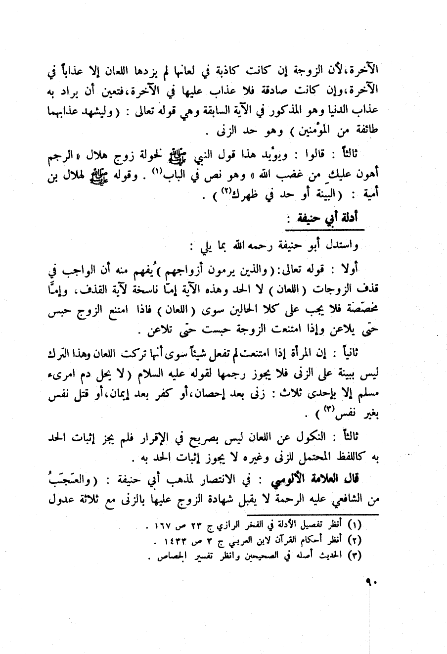 قال العلامة الألوسي: في الانتصار لمذهب أبي حنيفة: (والعَجَبُ من الشافعي عليه الرحمة لا يقبل شهادة الزوج عليها بالزنى مع ثلاثة عدول
