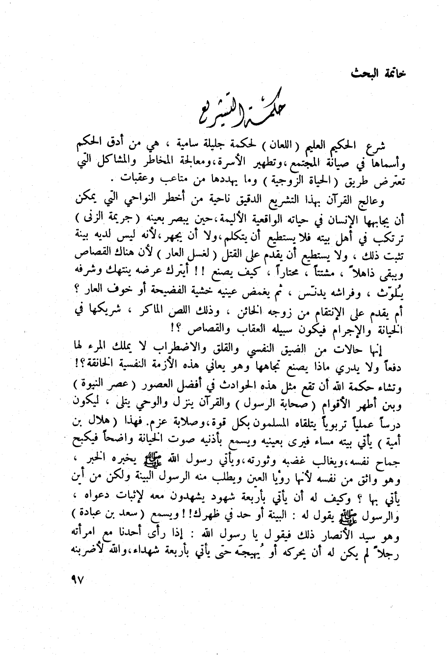 وعالج القرآن بهذا التشريع الدقيق ناحية من اخطر النواحي التي يمكن أن يجابهها الإنسان في حياته الواقعية الأليمة، حين يبصر بعينه (جريمة الزنى) ترتكب في أهل بيته فلا يستطيع أن يتكلم، ولا أن يجهر، لأنه ليس لديه بينة تثبت ذلك، ولا يستطيع أن يقدم على القتل (لغسل العار) لأن هناك القصاص ويبقى ذاهلاً، مشتتاً، محتاراً، كيف يصنع! {أيترك عرضه ينتهك وشرفه يُلوّث، وفراشه يدنّس، ثم يغمض عينيه خشية الفضيحة أو خوف العار؟ أم يقدم على الانتقام من زوجة الخائن، وذلك اللص الماكر، شريكها في الخيانة والإجرام فيكون سبيله العقاب والقصاص؟}
