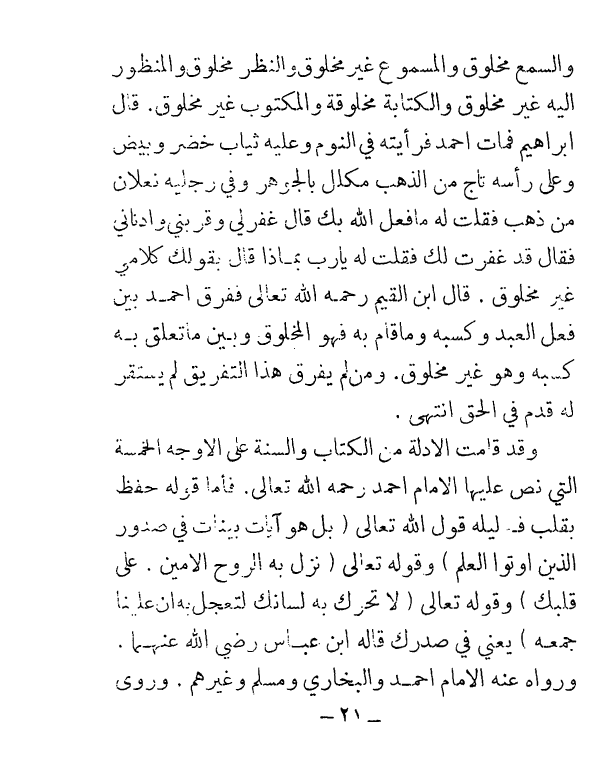 والسمع مخلوق والمسموع غير مخلوق والنظر مخلوق والمنظور اليه غير مخلوق والكتابة مخلوقة والمكتوب غير مخلوق. قال ابراهيم فمات احمد فرأيته في النوم وعليه ثياب خضر وبيض وعلى رأسه تاج من الذهب مكلل بالجوهر وفي رجليه نعلان من ذهب فقلت له ما فعل الله بك قال غفر لي وقربني وادناني فقال قد غفرت لك فقلت له يارب بماذا قال بقولك كلامي غير مخلوق. قال ابن القيم رحمه الله تعالى ففرق احمد بين فعل العبد وكسبه وما قام به فهو المخلوق وبين ما تعلق به كسبه وهو غير مخلوق. ومن لم يفرق هذا التفريق لم يستقر له قدم في الحق انتهى.