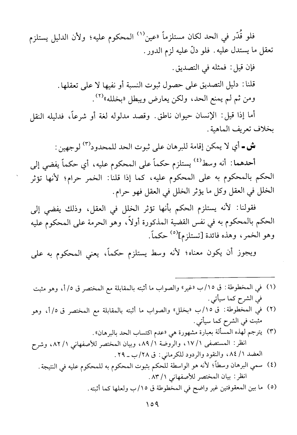 فلو قدر في الحد لكان مستلزما "عين المحكوم عليه؛ ولأن الدليل يستلزم تعقل ما يستدل عليه. فلو دل عليه لزوم الدور.