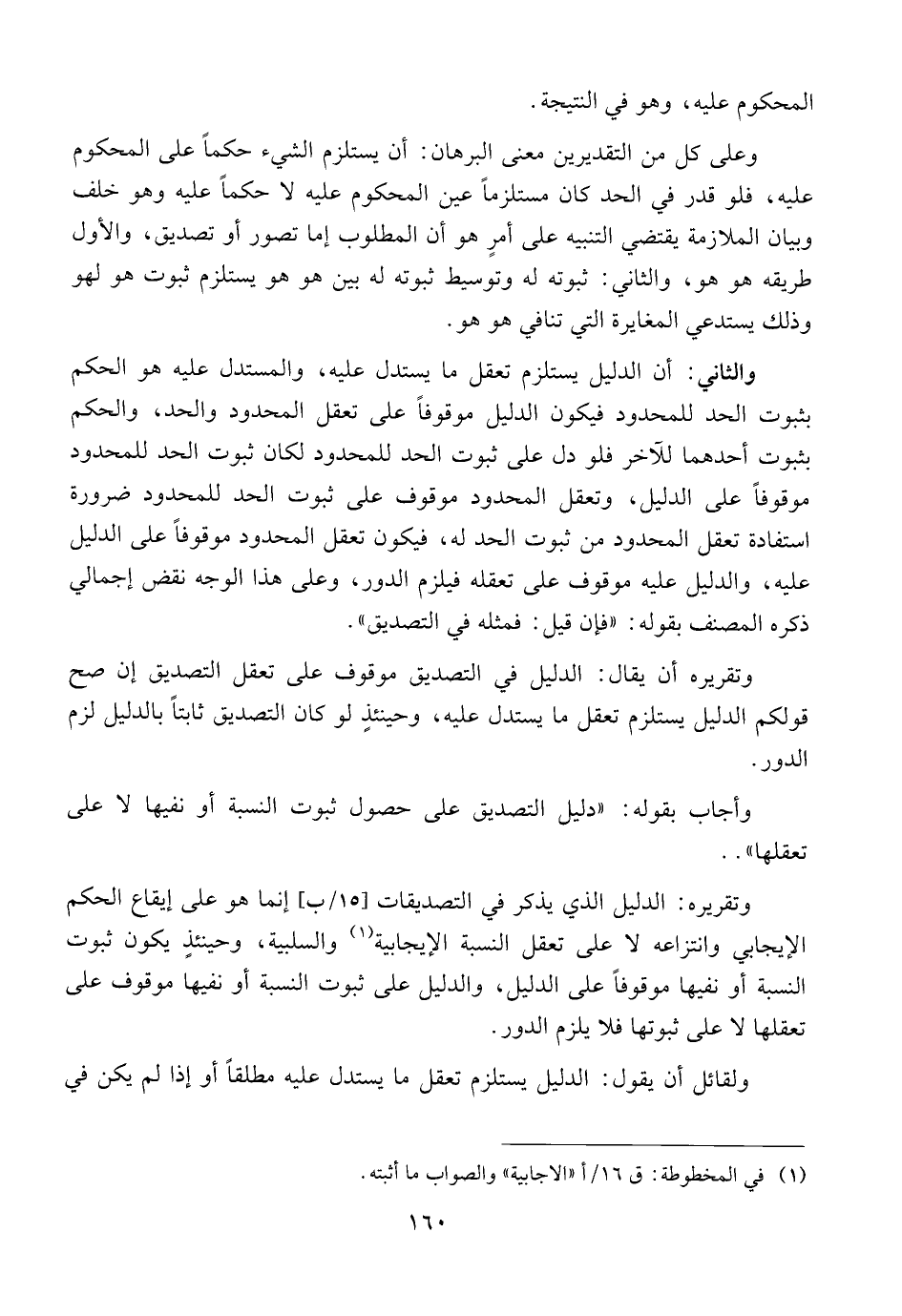 وعلى كل من التقديرين معنى البرهان: أن يستلزم الشيء حكما على المحكوم عليه، فلو قدر في الحد كان مستلزما عين المحكوم عليه لا حكما عليه وهو خلف وبيان الملازمة يقتضى التنبيه على أمر هو أن المطلوب إما تصور أو تصديق، والأول طريقه هو هو، والثاني: ثبوته له وتوسيط ثبوته له بين هو هو يستلزم ثبوت هو لهو وذلك يستدعى المغايرة التي تنافي هو هو.