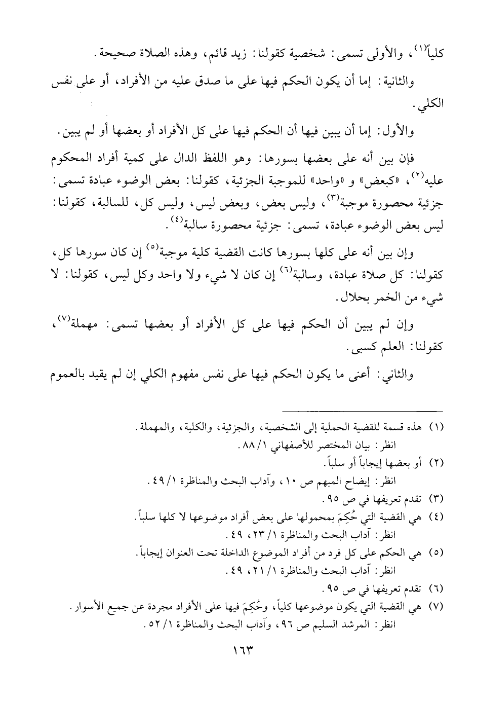 وإن تبين أنه على كلها بسورها كانت القضية كلية موجبة أن كان سورها كل، كقولنا: كل صلاة عبادة، وسالبة إن كان لا شيء ولا واحد وكل ليس، كقولنا: لا شيء من الخمر بحلال.