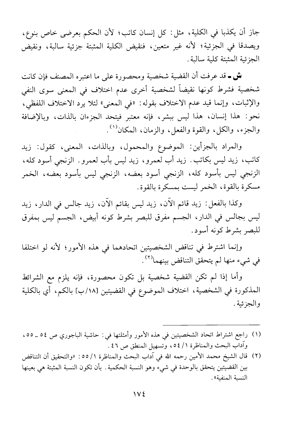 ش- قد عرفت أن القضية شخصية ومحصورة على ما اعتبره المصنف فإن كانت شخصية فشرط كونها نقيضا لشخصية أخرى عدم اختلاف في المعنى سوى النفي والإثبات، وإنما قيد عدم الاختلاف بقوله: "في المعنى "لئلا يرد الاختلاف اللفظي' نحو: هذا إنسان، هذا ليس بشر، فإنه معتبر فيتحد الجزءان بالذات، وبالإضافة والجزء، والكل، والقوة والفعل، والزمان، المكان.