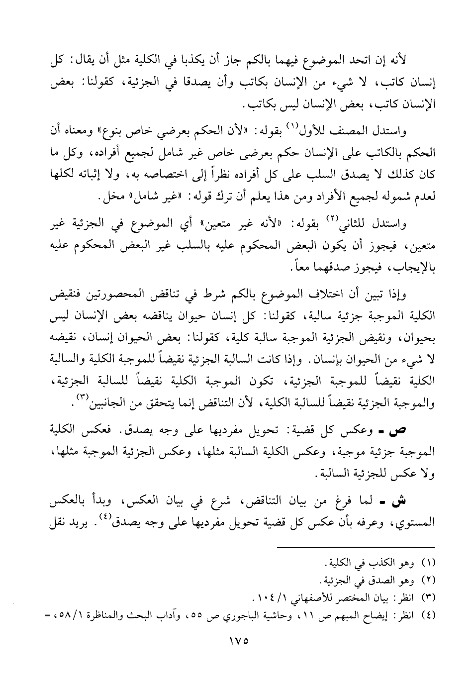 ص- وعكس كل قضية. تحويل مفرديها على وجه يصدق. فعكس الكلية الموجبة جزئية موجبة، وعكس الكلية السالبة مثلها، وعكس الجزئية الموجبة مقلها، ولا عكس للجزئية السالبة.