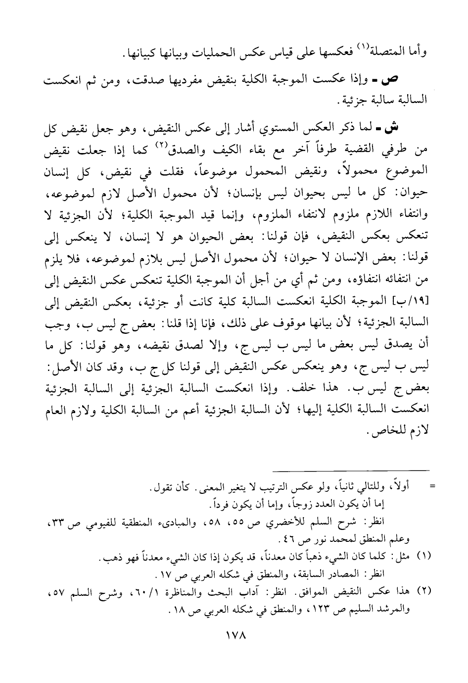 ش- لما ذكر العكس المستوى أشار إلى عكس النقيض، وهو جعل نقيض كل من طرفي القضية طرفا آخر مع بقاء الكيف والصدق كما إذا جعلت نقيض الموضوع محمولا، ونقيض المحمول ليس بإنسان؛ لأن محمول الأصل لازم لموضوعه، وانتقاء اللازم ملزوم لانتفاء الملزوم، وإنما قيد الموجبة الكلية؛ لأن الجزئية لا تنعكس بعكس النقيض، فإن قولنا: بعض الحيوان هو لا إنسان، لا ينعكس إلى قولنا: بعض الإنسان لا حيوان؛ لأن محمول الأصل ليس بلازم لموضوعه، فلا يلزم من انتقائه انتفاؤه، ومن ثم أي من أجل أن الموجبة الكلية تنعكس عكس النقيض إلى (١٩/ب) الموجبة الكلية انعكست السالبة كلية كانت أو جزئية، بعكس النقيض إلى السالبة الجزئية؛ لأن بيانها موقوف على ذلك، فإنا إذا قلنا: بعض ج ليس ب، وجب أن يصدق ليس بعض ما ليس ب ليس ج، وإلا لصدق نقيضه، وهو قولنا: كل ما ليس ب ليس ج، وهو ينعكس عكس النقيض إلى قولنا كل ج ب، وقد كان الأصل: بعض ج ليس ب. هذا خلف. وإذا انعكست السالبة الجزئية إلى السالبة الجزئية انعكست السالبة الكلية إليها؛ لأن السالبة الجزئية أعم من السالبة الكلية ولازم العام لازم للخاص.