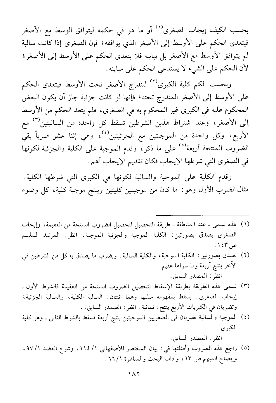 وبحسب الكم كلية الكبرى ليندرج تحته؛ فإنها لو كانت جزئية جاز أن يكون البعض المحكوم عليه في الكبرى غير المحكوم به في الصغرى، فلم يتعد الحكم من الأوسط إلى الأصغر، وعند اشتراط هذين الشرطين تسقط كل واحدة من السالبتين مع أربع، وكل واحدة من الموجبتين مع الجزئيتين، وهي اثنا عشر ضربا بقى الضروب المنتجة أربعة على ما ذكر، وقدم الموجبة على الكلية والجزئية لكونها في الصغرى التي شرطها الايجاب فكان تقديم الايجاب أهم.