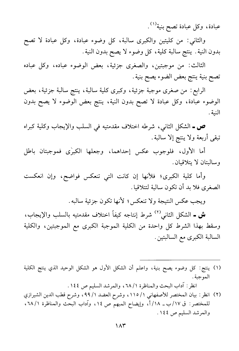 ش- الشكل الثاني شرط إنتاجه كيفا اختلاف مقدميته بالسلب والايجاب، وسقط بهذا الشرط كل واحد من الكلية الموجبة الكبرى مع الموجبتين، والكلية السالبة الكبرى مع السالبتين.
