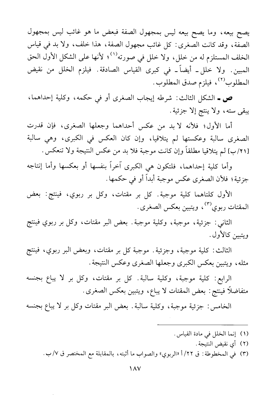 الثالث: كلية موجبة، جزئية, موجبة كل بر مقتات، وبعض البر ربوي، فينتج مثله، ويتبين بعكس الكبرى وجعلها الصغرى وعكس النتيجة.