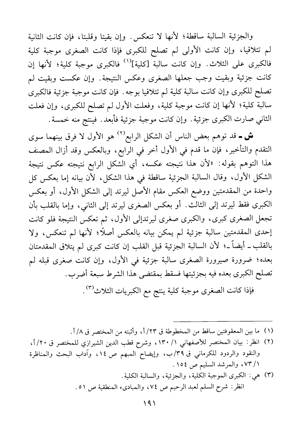 ش- قد توهم بعض الناس أن الشكل الرابع هو الأول لا فرق بينهما سوى التقدم والتأخير، فأن ما قدم في الأول أخر في الرابع، وبالعكس وقد أزال المصنف هذا نتيجة عكسه، أي الشكل الرابع نتيجته عكس نتيجة الشكل الأول، وقال السالبة الجزئية ساقطة في هذا الشكل، لأن بيانه إما بعكس كل واحدة من المقدمتين ووضع العكس مقام الأصل ليرتد إلى الشكل الأول، أو بعكس الكبرى فقط ليرتد إلى الثالث. أو بعكس الصغرى ليرتد إلى الثاني، وإما بالقلب بأن تجعل الصغرى كبرى، والكبرى صغرى ليرتد إلى الأول، ثم تعكس النتيجة فلو كانت احدى المقدمتان بعده؛ ضرورة صيرورة الصغرى سالبة جزئية في الأول، وإن كانت صغرى قبله لم تصلح الكبرى بعده فيه بجزئيتها فسقط بمقتضى هذا الشرط سبعة أضرب.