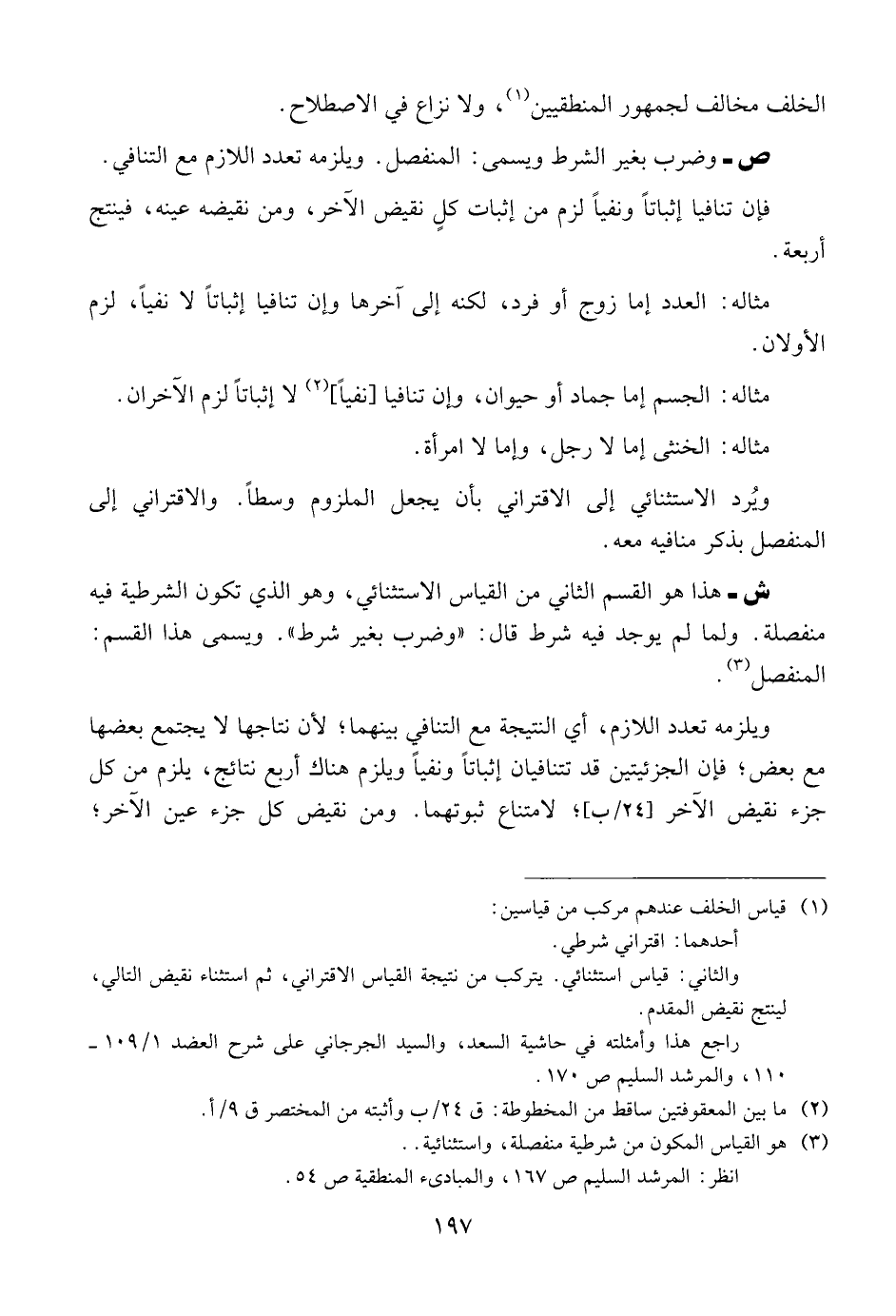 ش- هذا هو القسم الثاني من القياس الاستثنائي، وهو الذي تكون الشرطية فيه منفصلة. ولما لم يوجد فيه شرط قال: " وضرب بغير شرط ". ويسمى هذاالقسم: المنفصل.