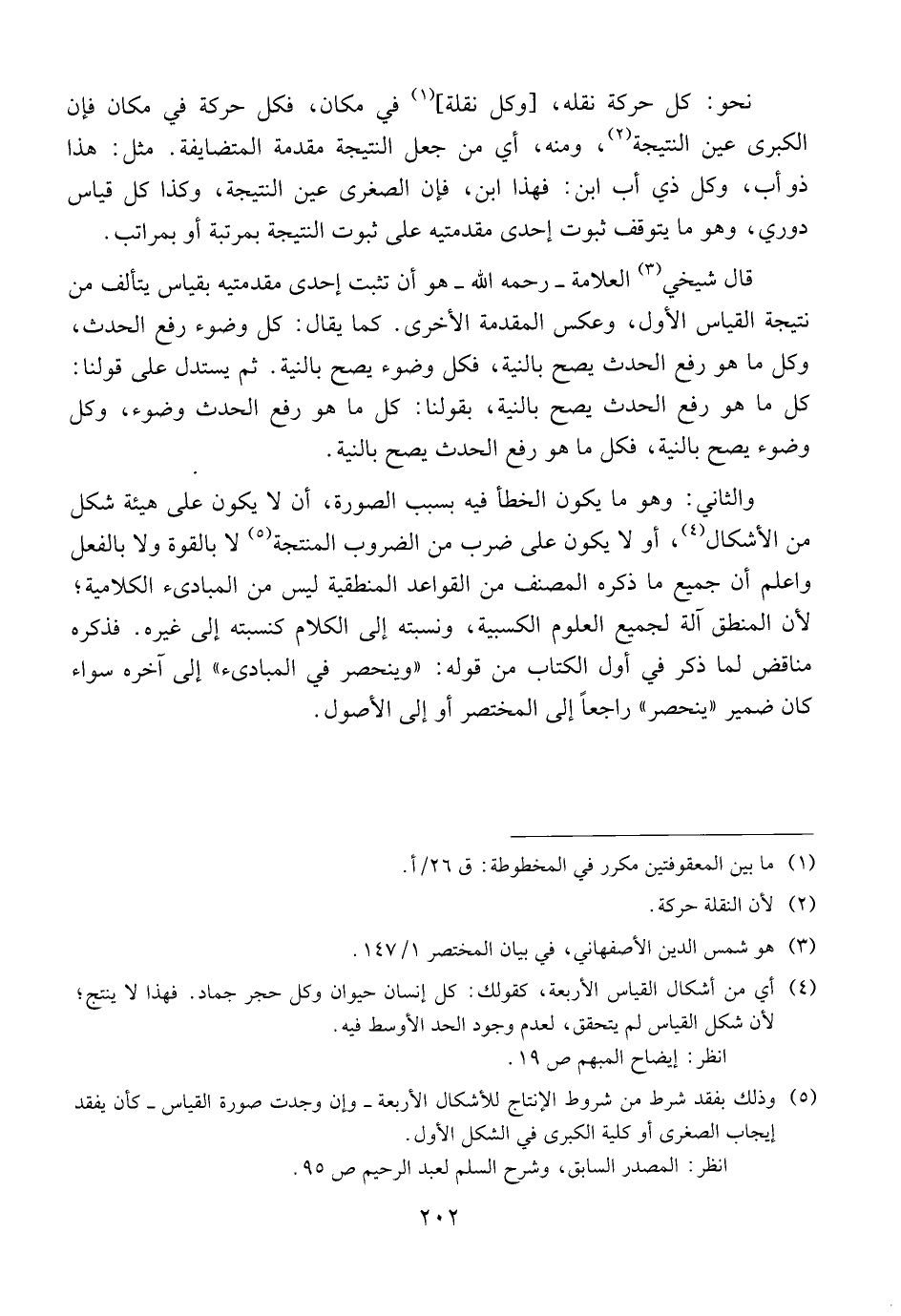 نحو: كل حركة نقله، (وكل نقلة) في مكان، فكل حركة في مكان فإن الكبرى عين النتيجة، ومنه، أي من جعل النتيجة مقدمة المتضايقة. مثل: هذا ذو أب، وكل ذي أب ابن: فهذا ابن، فإن الصغرى عين النتيجة، وكذا كل قياس دوري، وهو ما يتوقف ثبوت إحدى مقدمتيه على ثبوت النتيجة بمرتبة أو بمراتب.