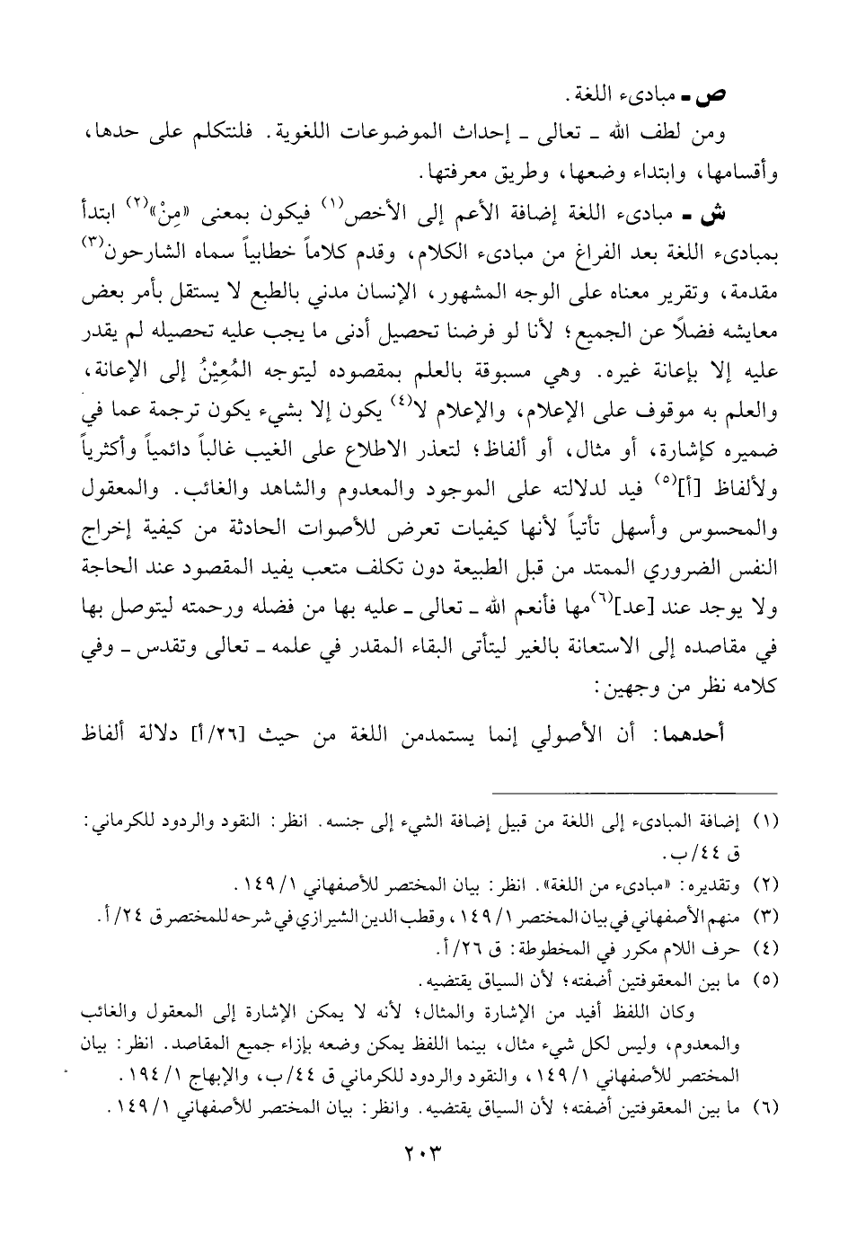 ش- مبادئ اللغة إضافة الأعم إلى الأخص فيكون بمعنى "من" ابتدأ بمبادئاللغة بعد الفراغ من مبادئ الكلام، وقدم كلاما خطابيا سماه الشارحون مقدمة، وتقرير معناه على الوجه المشهور، الإنسان مدنى بالطبع لا يستقل بأمر بعض معايشه فضلا عن الجميع؛ لأنا لو فرضنا تحصيل أدنى ما يجب عليه تحصيله لم يقدر عليه إلا بإعانة غيره. وهي مسبوقة بالعلم بمقصودة ليتوجه المعين إلى الإعانة، والعلم به موقوف على الإعلام، والإعلام لا يكون إلا بشيء يكون ترجمة عما في ضميره كإشارة، أو مثال، أو ألفاظ لتعذر الاطلاع على الغيب غالبا دائميا وأكثريا ولألفاظ (أ) فيد لدلالته على الموجود والمعدوم والشاهد والغائب. والمعقول والمحسوس وأسهل تأتيا لأنها كيفيات تعرض للأصوات الحادثة من كيفية إخراج النفس الضروري الممتد من قبل الطبيعة دون تكلف متعب يفيد المقصود عند الحاجة ولا يوجد عند (عد) مها فأنعم الله -تعالى- عليه بها من فضله ورحمته ليتوصل بها في مقاصده إلى الاستعانة بالغير ليتأتى البقاء المقدر في عمله -تعالى وتقدس- وفي كلامه نظر من وجهين: