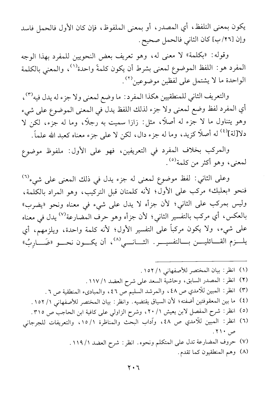 وعلى الثاني: لفظ موضوع لمعنى له جزء يدل في ذلك المعنى على شيء فنحو"بعلبك" مركب على الأول؛ لأنه كلمتان قبل التركيب، وهو المراد بالكلمة، وليس بمركب على الثاني؛ لأن جزأه لا يدل على شيء في معناه ونحو" يضرب" بالعكس، أي مركب بالتفسير الثاني؛ لأن جزأه وهو حرف المضارعة يدل في معناه على شيء، ولا يكون مركبا على التفسيرالأول؛ لأنه كلمة واحدة، ويلزمهم، أي يلزم القائلين بالتفسير. الثاني، أن يكون نحو"ضارب"