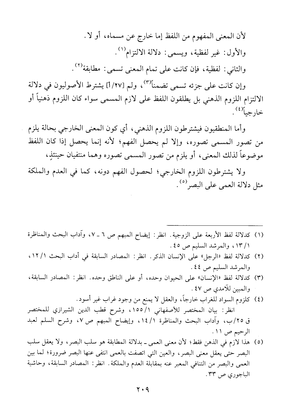 وأما المنطقيون فيشترطون اللزوم الذهني، أي كون المعنى الخارجي بحالة يلزم يلزم من تصور المسمى تصوره، وإلا لم يحصل الفهم؛ لأنه إنما يحصل الفهم؛ لأنه إنما يحصل إذا كان اللفظ موضوعا لذلك المعنى، أو يلزم من تصور المسمى تصوره وهما منتفيان حينئذ، ولا يشترطون اللزوم الخارجي؛ لحصول الفهم دونه، كما في العدم والملكة مثل دلالة العمى على البصر.