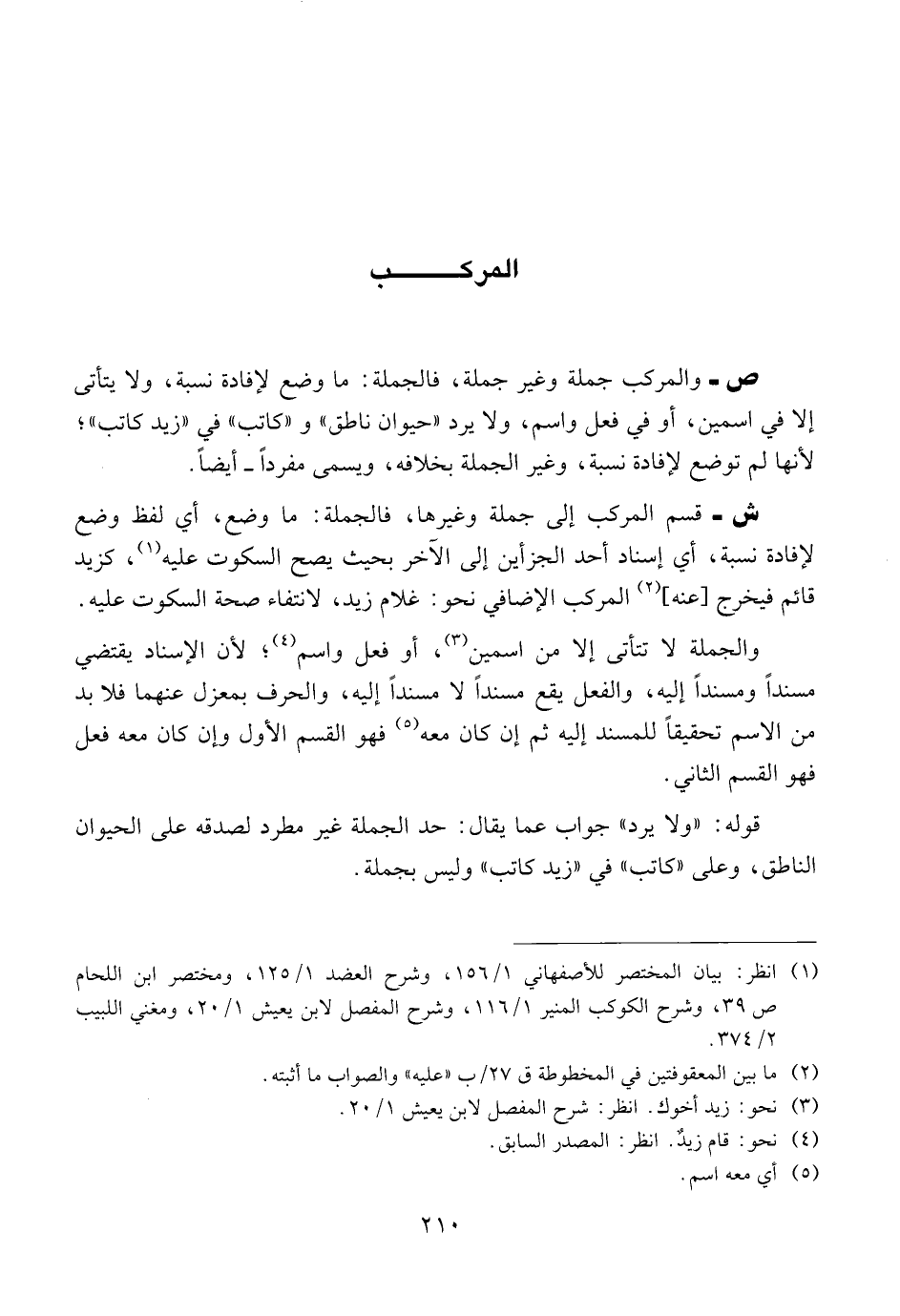 ص- والمركب جملة وغير جملة، فالجملة: ما وضع لإفادة نسبة، ولا يتأتى إلا في اسمين، أو في فعل واسم، ولا يرد "حيوان ناطق" و"كاتب" في "زيد كاتب"؛ لأنها لم توضع لإفادة نسبة، وغير الجملة بخلافه، ويسمى مفردا- أيضا.
