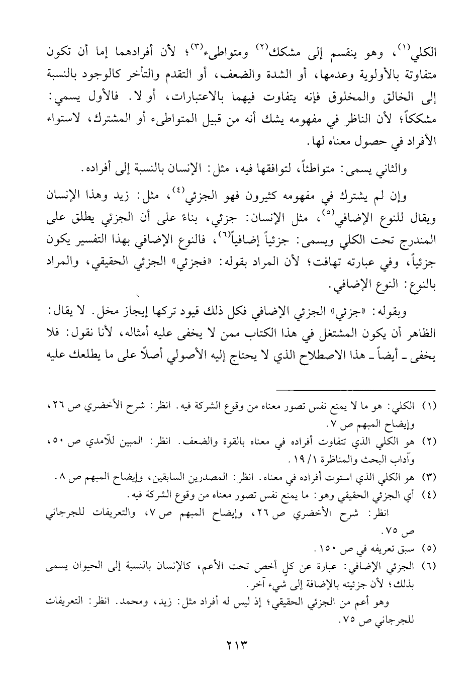 وإن لم يشترك في مفهومه كثيرون فهو الجزئي، مثل: زيد وهذا الإنسان ويقال للنوع الإضافي، مثل الإنسان: جزئي، بناء على أن الجزئي يطلق على المندرج تحت الكلي ويسمى: جزئيا إضافيا، فالنوع الإضافي بهذا التفسير يكون جزئيا، وفى عبارته تهافت؛ لأن المراد بقوله: "فجزئي" الجزئيالحقيقي، والمراد بالنوع: النوع الإضافي.