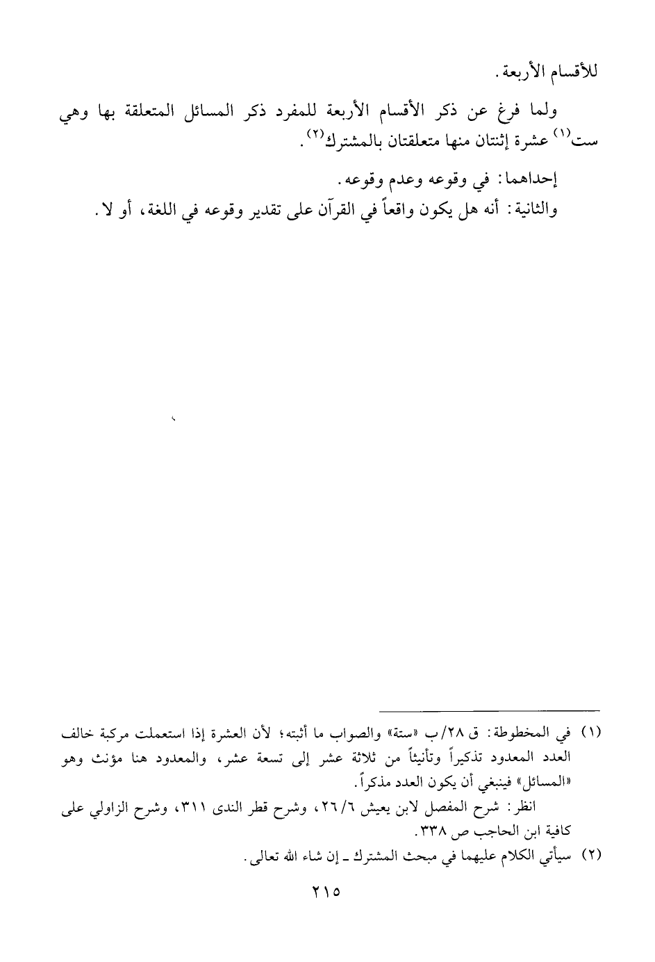 ولما فرغ عن ذكر الأقسام الأربعة للمفرد ذكر المسائل المتعلقة بها وهي ست عشرة اثنتان منا متعلقتان بالمشترك.