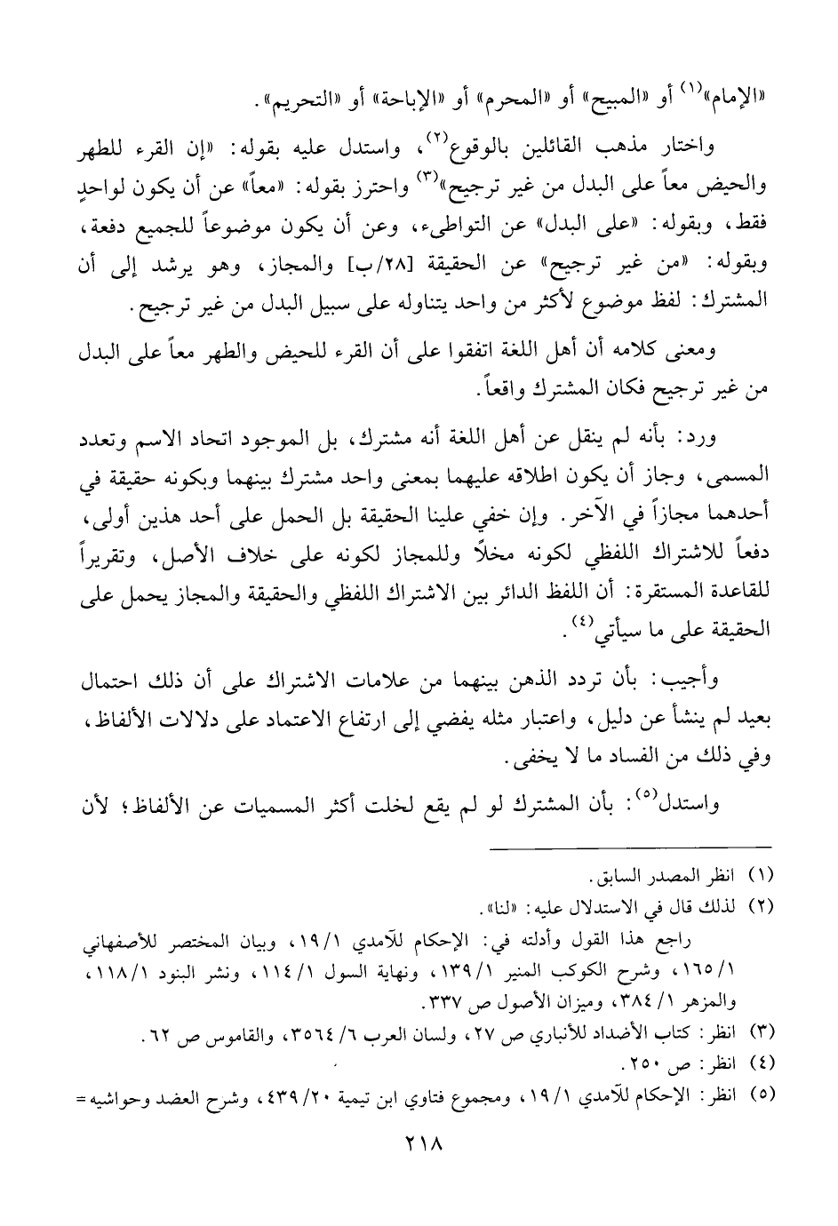 واختار مذهب القائلين بالوقوع، واستدل عليه بقوله: "إن القرء للطهر والحيض معا على البدل من غير ترجيح" واحترز بقوله: "معا" عن أن يكون لواحد فقط، وبقوله: "على البدل" عن التواطاء، وعن أن يكون موضوعا للجميع دفعة، وبقوله: "من غير ترجيح" عن الحقيقة (٢٨/ب) والمجاز، وهو يرشد إلى أن المشترك: لفظ موضوع لأكثر من واحد يتناوله على سبيل البدل من غير ترجيح.