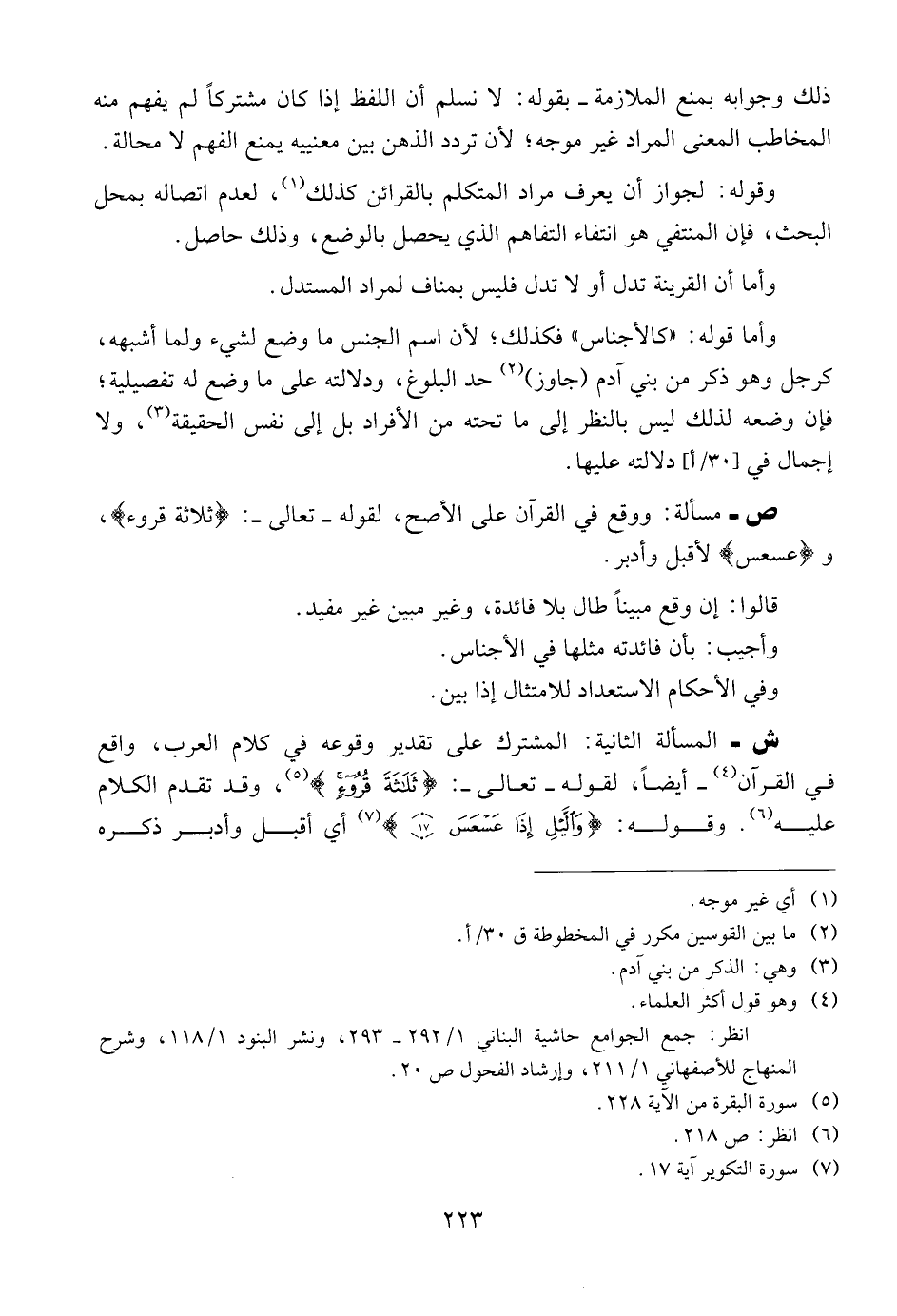 ش- المسألة الثانية: المشترك على تقدير وقوعه في كلام العرب، واقع في القرآن -أيضا، لقوله -تعالى-: (ثلثه قروء)، وقد تقدم الكلام عليه. وقوله: (والليل إذا عسعس) أي أقبل وأدبر ذكره
