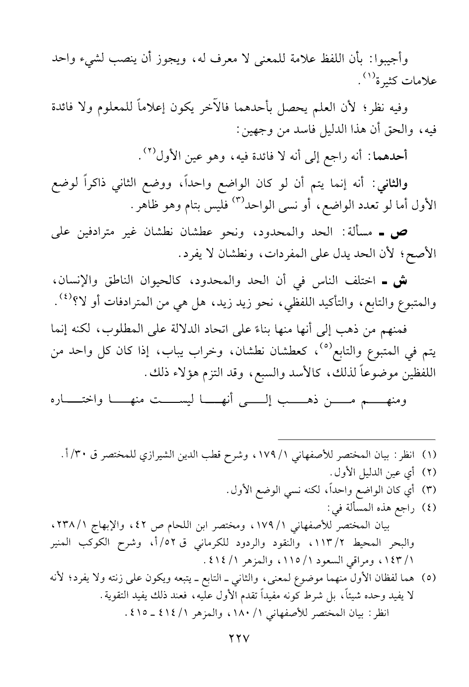ش- اختلف الناس في أن الحد والمحدود، كالحيوان الناطق والإنسان، والمتبوع والتابع، والتأكيد اللفظي، نحو زيد زيد، هل هي من المترادفات أو لا؟.
