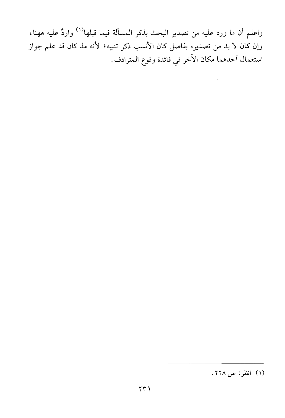 واعلم أن ما ورد عليه من تصدير البحث بذكر المسألة فيما قبلها وارد عليه ههنا، وإن كان لابد من تصديره بفاصل كان الأنسب ذكر تنبيه؛ لأنه منذ كان قد علم جواز استعمال أحدهما مكان الآخر في فائدة وقوع المترادف.