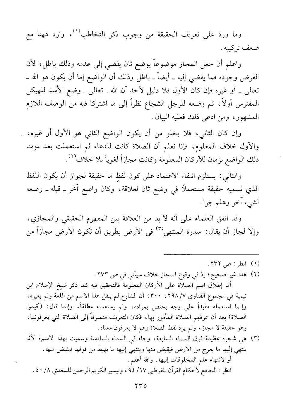 وقد اتفق العلماء على أنه لابد من العلاقة بين المفهوم الحقيقي والمجازي، وإلا لجاز أن يقال: سدرة المنتهى في الأرض بطريق أن تكون الأرض مجازا من