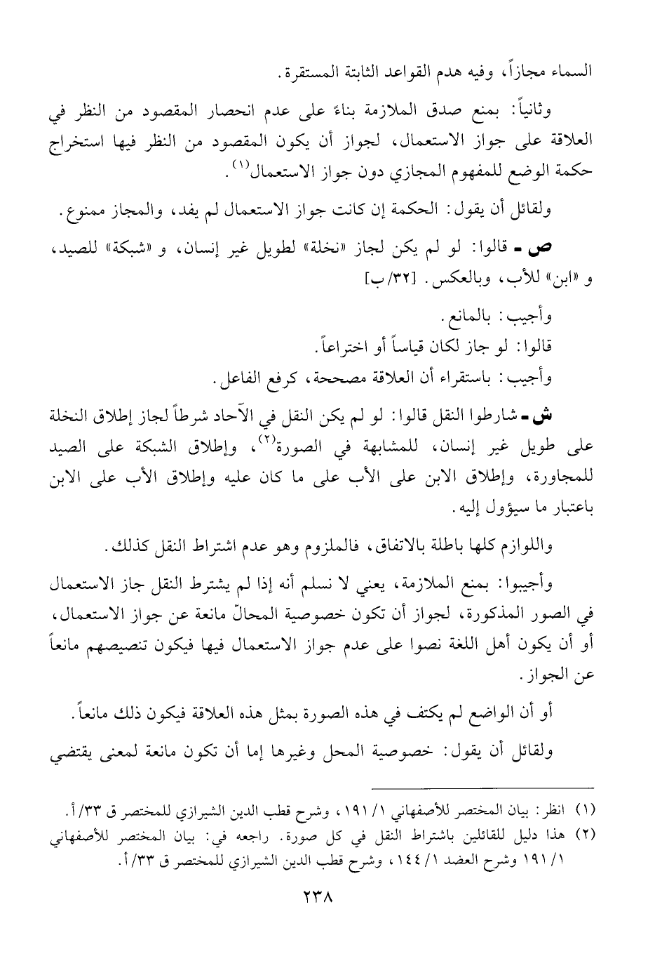 ص- قالوا: لو لم يكن لجاز "نخلة" لطويل غير إنسان، و"شبكة" للصيد، و"ابن" للأب، وبالعكس. (٣٢/ب)