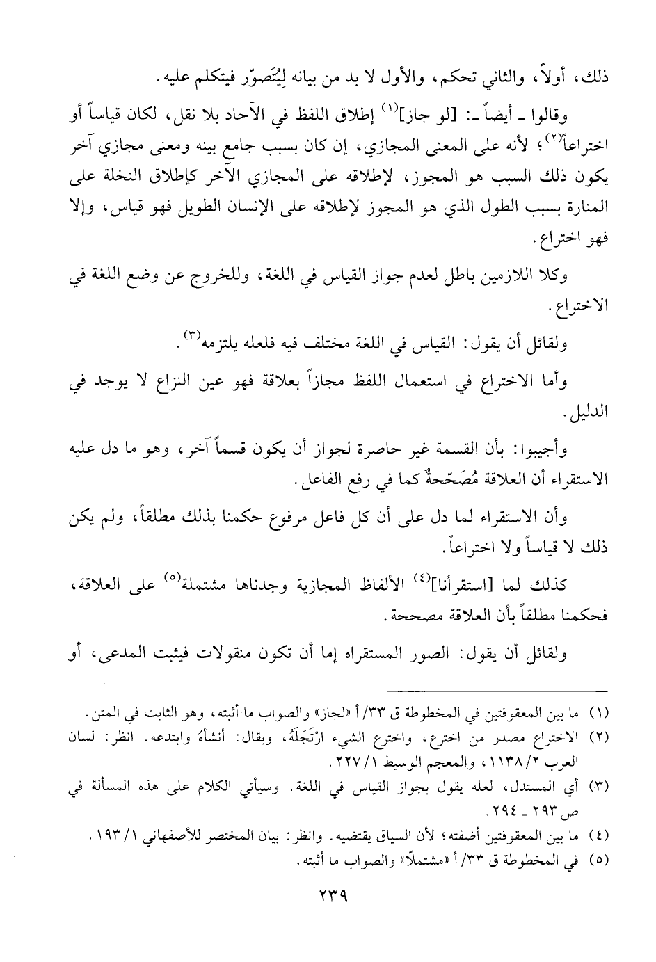 وقالوا -أيضا-: (لو جاز) إطلاق اللفظ في الآحاد بلا نقل، لكان قياسا أو اختراعا؛ لأنه على المعنى المجازي، إن كان بسبب جامع بينه ومعنى مجازي آخر يكون ذلك السبب هو المجوز، لإطلاقه على الإنسان الطويل فهو قياس، وإلا فهو اختراع.