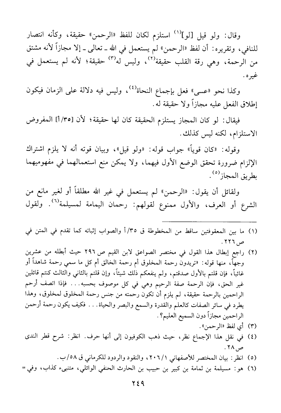 وقال: ولو قيل [لو] استلزم لكان للفظ {{الرحمن}} حقيقة، وكأنه انتصار للنافي، وتقريره: أن لفظ {{الرحمن}} لم يستعمل في الله ــ تعالى ــ إلا مجازاً لأنه مشتق من الرحمة، وهي رقة القلب حقيقة، وليس له حقيقة؛ لأنه لم يستعمل في غيره.