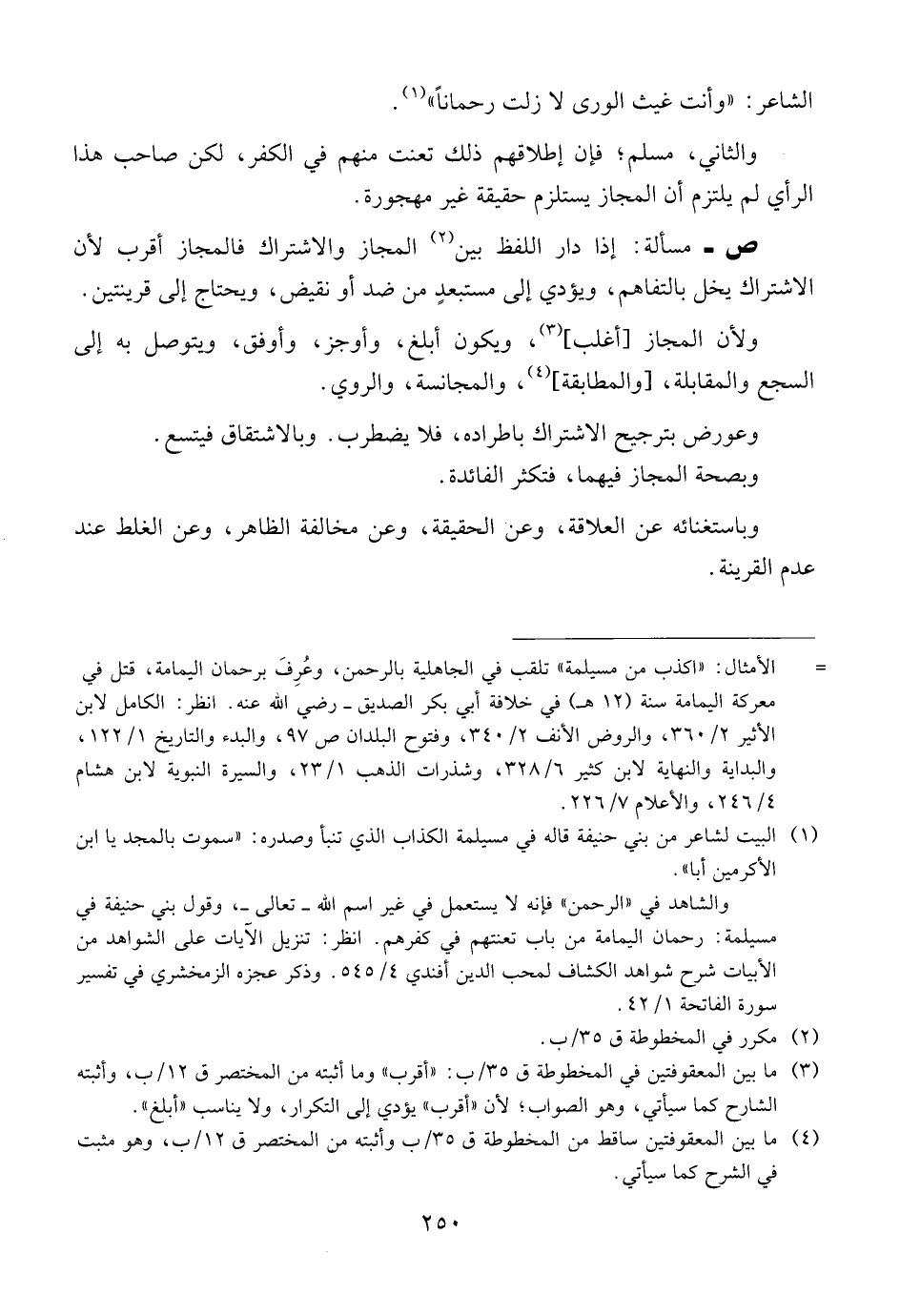 والثاني، مسلم؛ فإن إطلاقهم ذلك تعنت منهم في الكفر، لكن صاحب هذا الرأي لم يلتزم أن المجاز يستلزم حقيقة غير مهجورة.