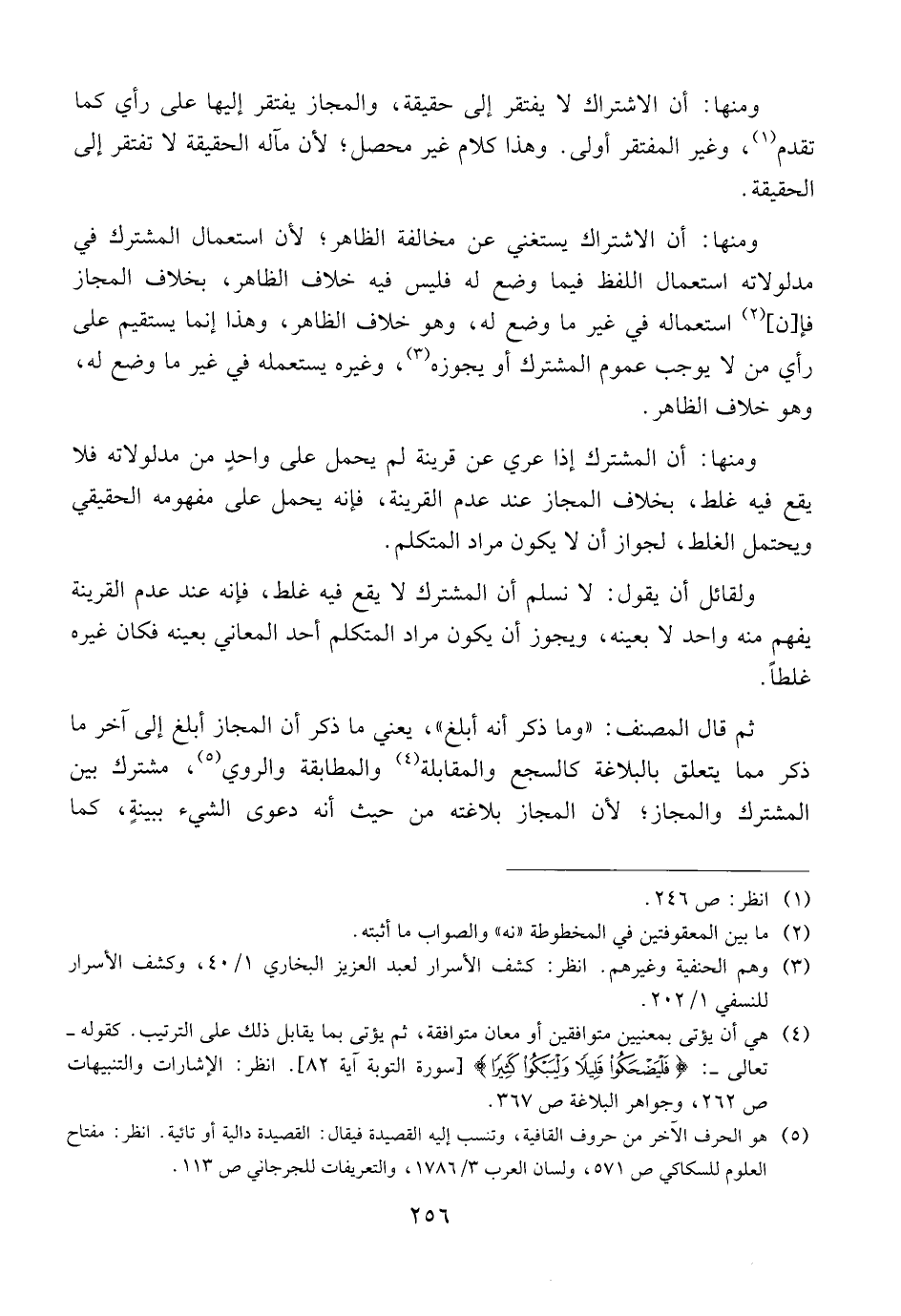 ومنها: أن الاشتراك يستغني عن مخالفة الظاهر؛ لأن استعمال المشترك في مدلولاته استعمال اللفظ فيما وضع له فليس فيه خلاف الظاهر، بخلاف المجاز فإ [ن] استعماله في غير ما وضع له، وهو خلاف الظاهر، وهذا إنما يستقيم على رأي من لا يوجب عموم المشترك أو يجوزه، وغيره يستعمله في غير ما وضع له، وهو خلاف الظاهر.