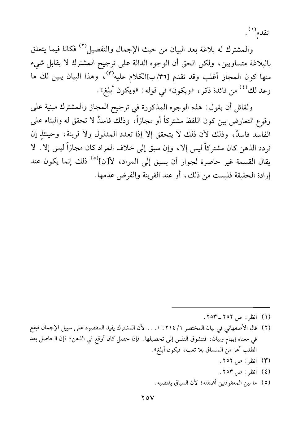 والمشترك له بلاغة بعد البيان من حيث الإجمال والتفصيل فكانا فيما يتعلق بالبلاغة متساويين، ولكن الحق أن الوجوه الدالة على ترجيح المشترك لا يقابل شيء منها كون المجاز أغلب وقد تقدم [٣٦/ب] الكلام عليه، وهذا البيان يبين لك ما وعد لك من فائدة ذكر، {{ويكون}} في قوله: {{ويكون أبلغ}}.