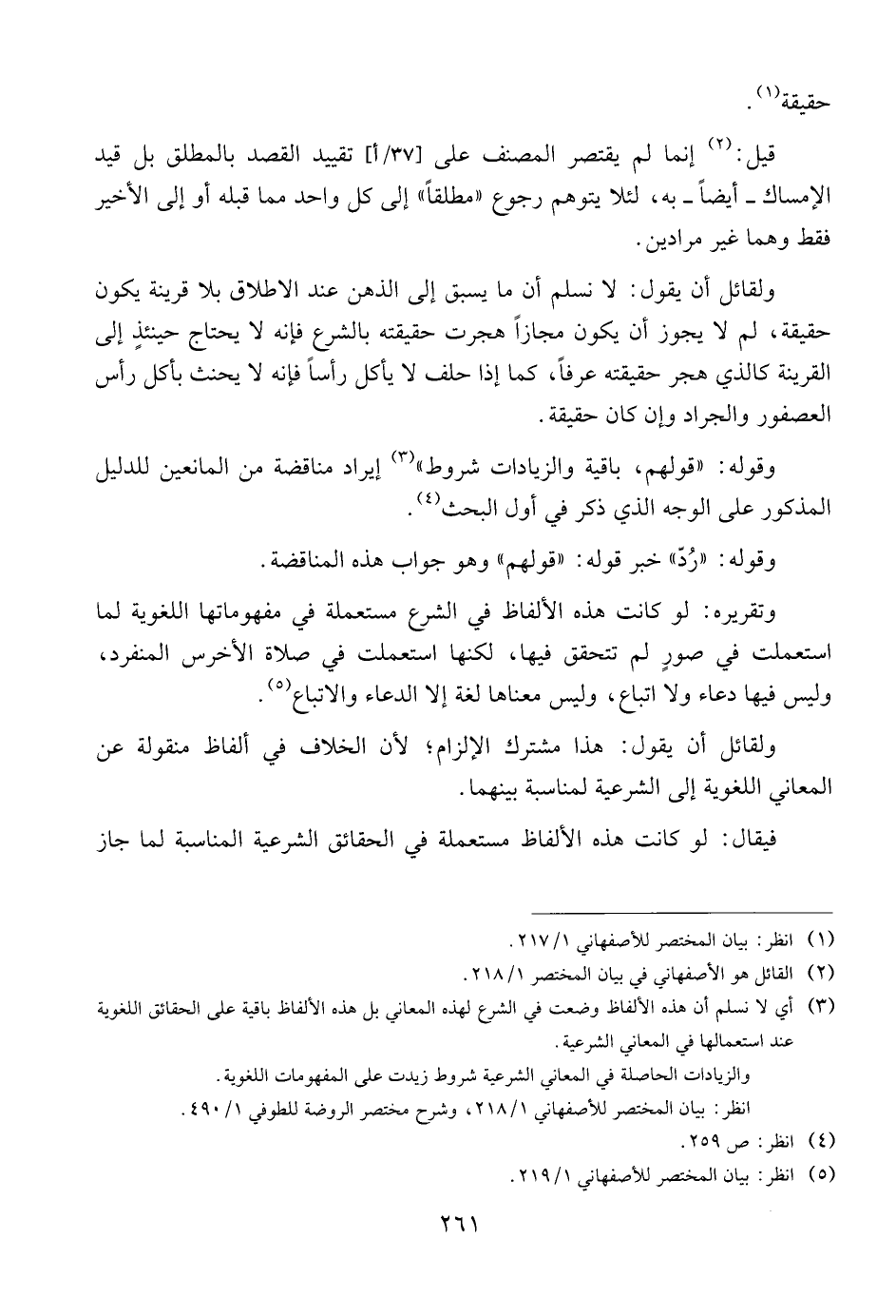 ولقائل أن يقول: هذا مشترك الإلزام؛ لأن الخلاف في ألفاظ منقولة عن المعاني اللغوية إلى الشرعية لمناسبة بينهما.