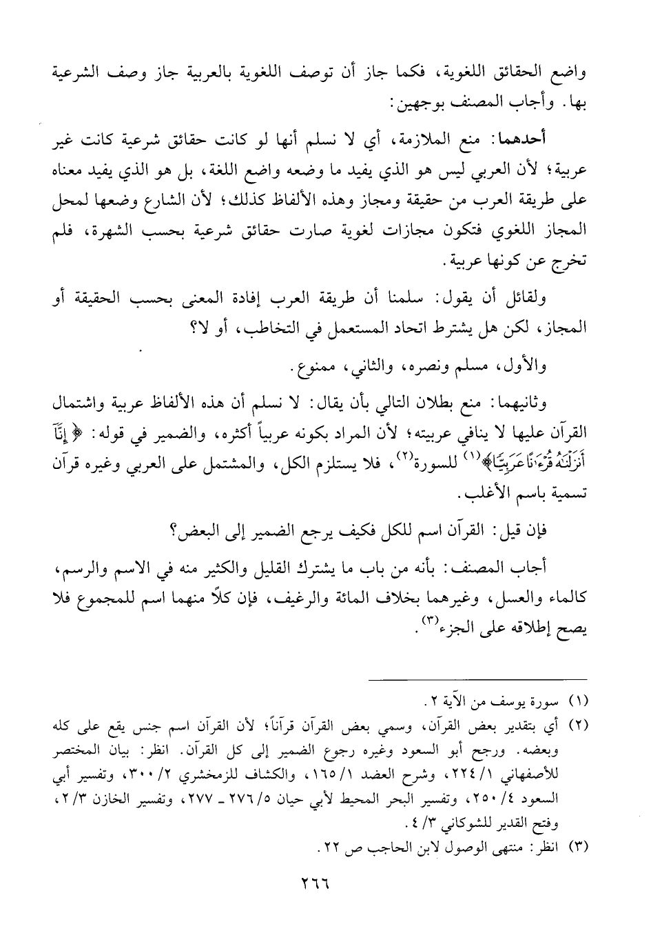 وثانيهما: منع بطلان التالي بأن يقال: لا نسلم أن هذه الألفاظ عربية واشتمال القرآن عليها لا ينافي عربيته؛ لأن المراد بكونه عربياً أكثره، والضمير في قوله: {إِنَّا أَنزَلنَاهُقُرآنًا عَرَبِيّا} للسورة، فلا يستلزم الكل، والمشتمل على العربي وغيره قرآن تسمية باسم الأغلب.