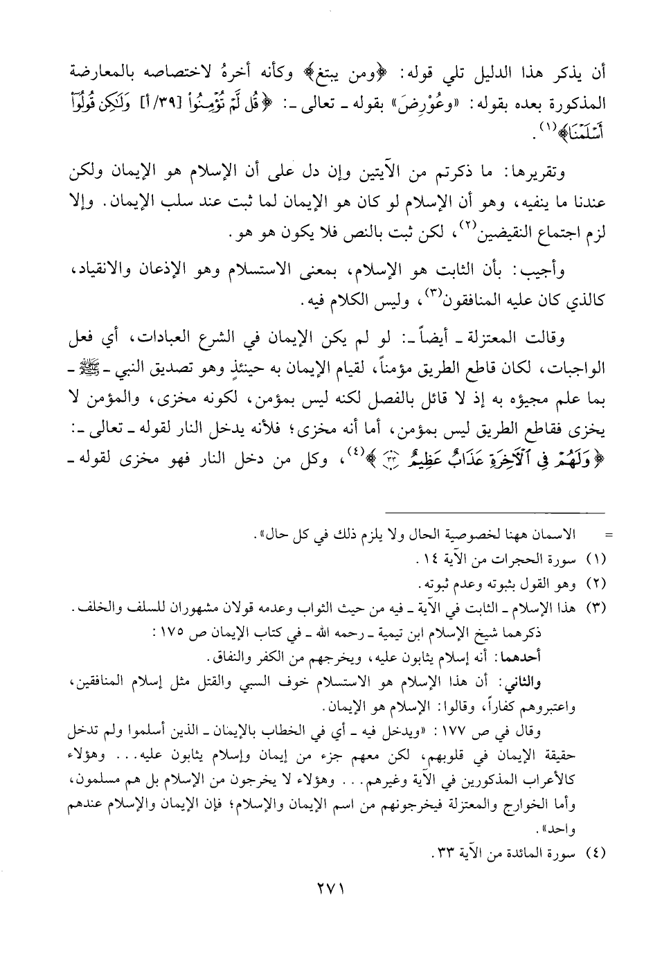 وتقريرها: ما ذكرتم من الآيتين وإن دل على أن الإسلام هو الإيمان ولكن عندنا ما ينفيه، وهو أن الإسلام لو كان هو الإيمان لما ثبت عند سلب الإيمان. وإلا لزم اجتماع النقيضين، لكن ثبت بالنص فلا يكون هو هو.