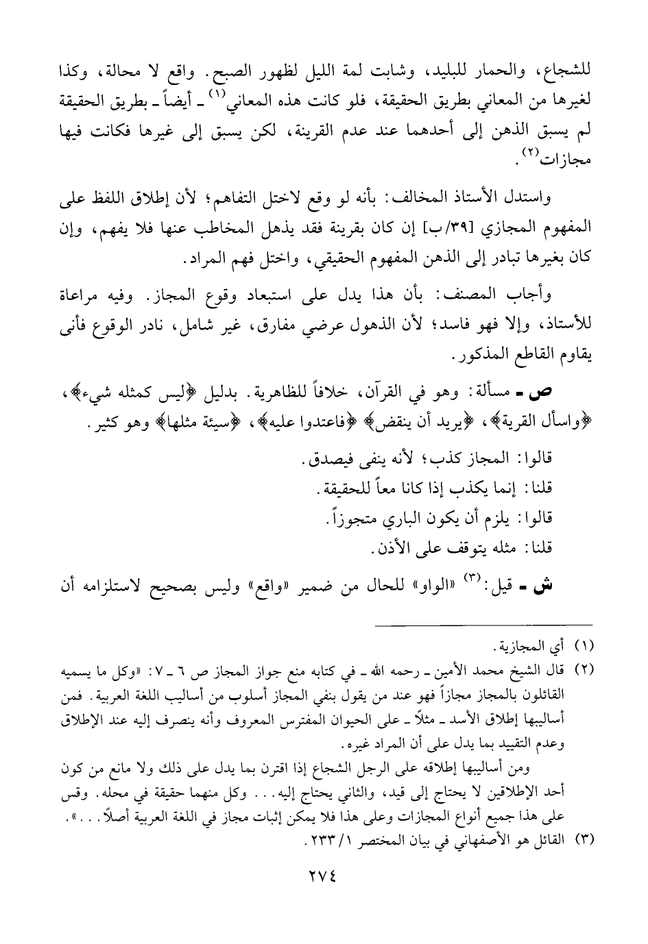 وأجاب المصنف: بأن هذا يدل على استبعاد وقوع المجاز. وفيه مراعاة للأستاذ، وإلا فهو فاسد؛ لأن الذهول عرضي مفارق، غير شامل، نادر الوقوع فأنى يقاوم القاطع المذكور.