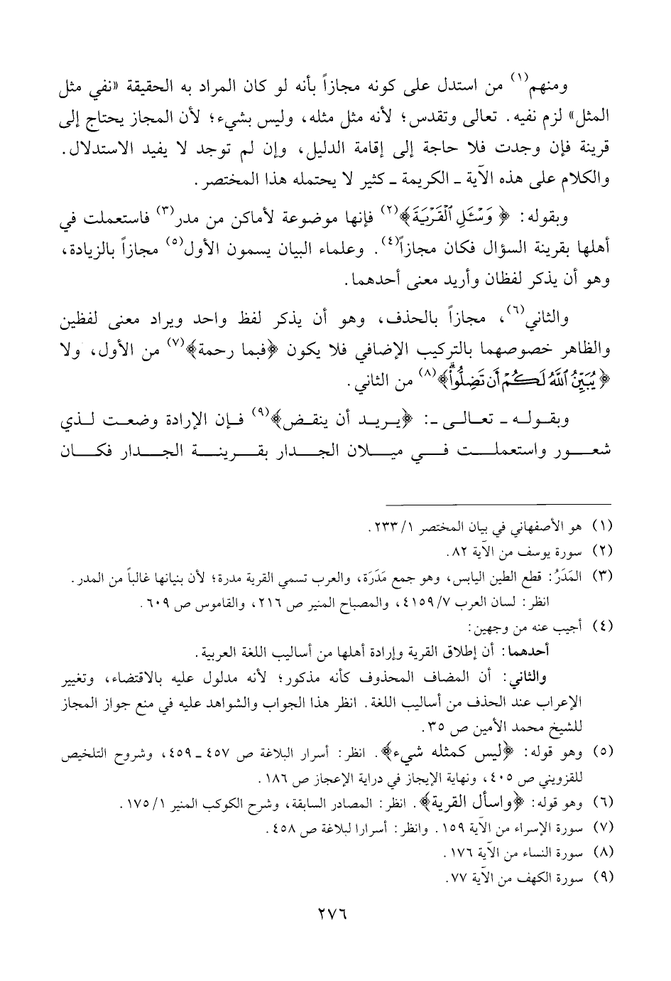 ومنهم من استدل على كونه مجازاً بأنه لو كان المراد به الحقيقة {{نفي مثل المثل}} لزم نفيه. تعالى وتقدس؛ لأنه مثل مثله، وليس بشيء؛ لأن المجاز يحتاج إلى قرينة فإن وجدت فلا حاجة إلى إقامة الدليل، وإن لم توجد لا يفيد الاستدلال. والكلام على هذه الآية ــ الكريمة ــ كثير لا يحتمله هذا المختصر.