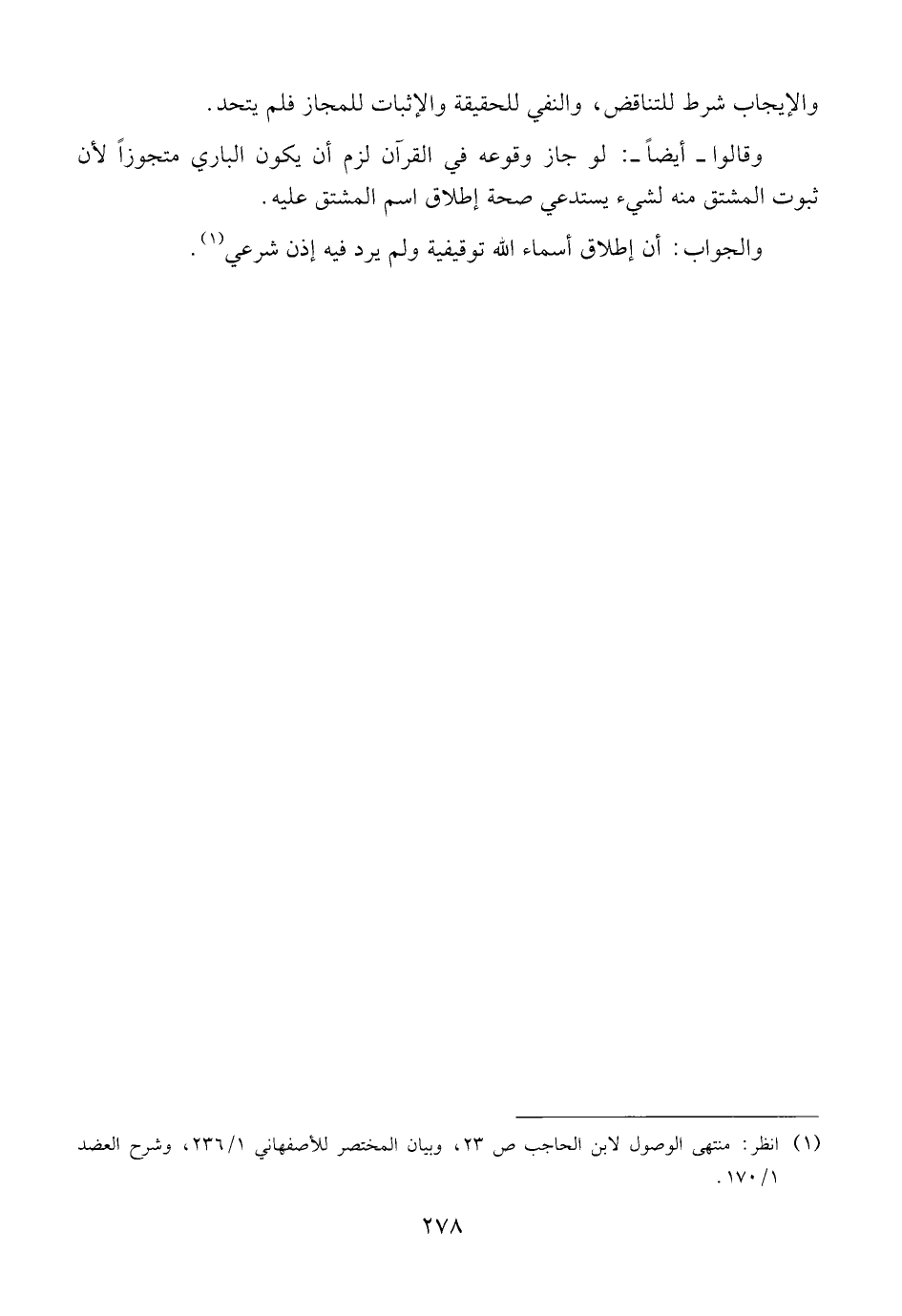 وقالوا ــ أيضاً ــ: لو جاز وقوعه في القرآن لزم أن يكون الباري متجوزاً لأن ثبوت المشتق منه لشيء يستدعي صحة إطلاق اسم المشتق عليه.