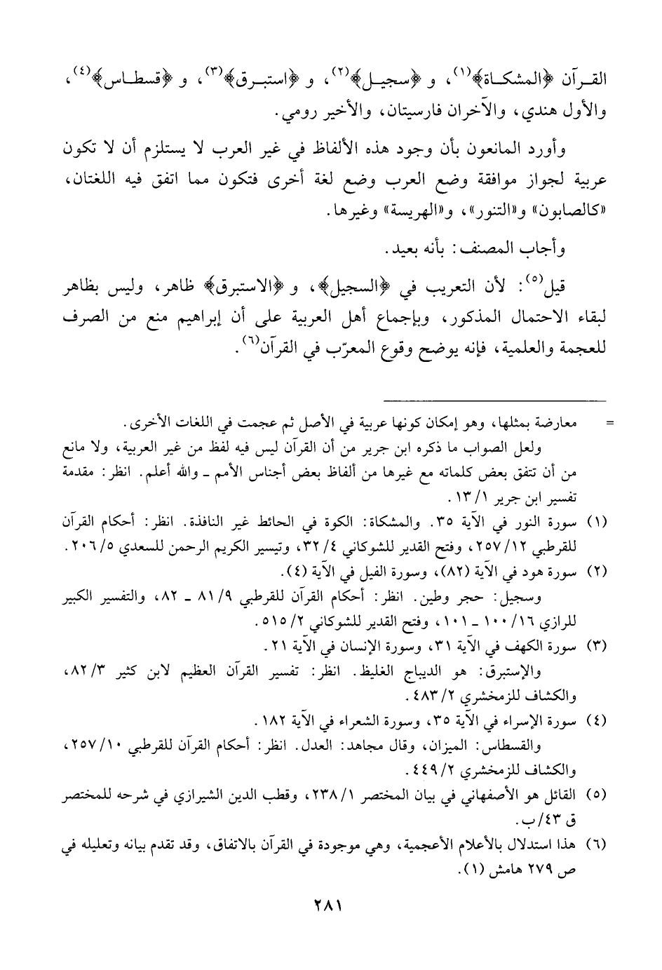 القرآن {المشكاة}، و {سجيل}، و {استبرق}، و {قسطاس}، والأول هندي، والآخران فارسيان، والأخير رومي.