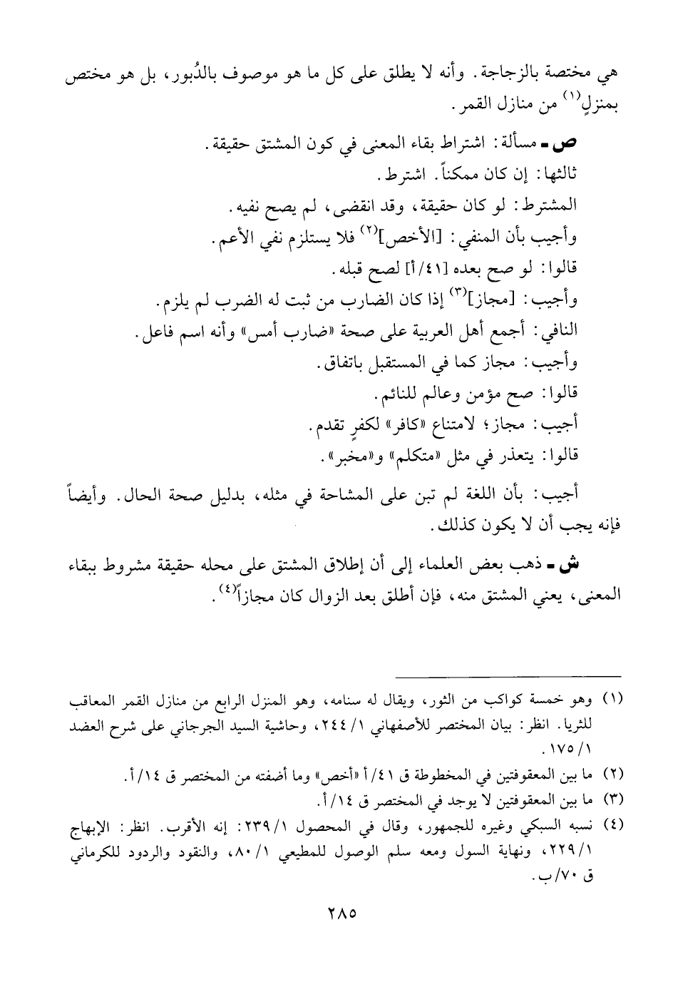 ش ــ ذهب بعض العلماء إلى أن إطلاق المشتق على محله حقيقة مشروط ببقاء المعنى، يعني المشتق منه، فإن أطلق بعد الزوال كان مجازاً.
