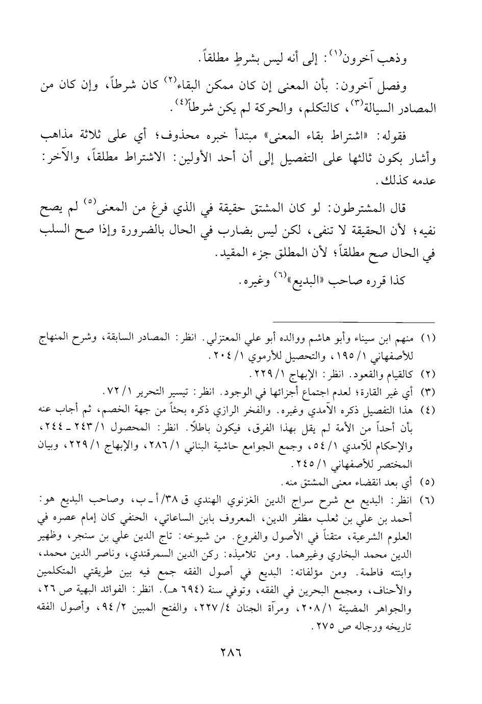 وفصل آخرون: بأن المعنى إن كان ممكن البقاء كان شرطاً، وإن كان من المصادر السيالة، كالتكلم، والحركة لم يكن شرطاً.