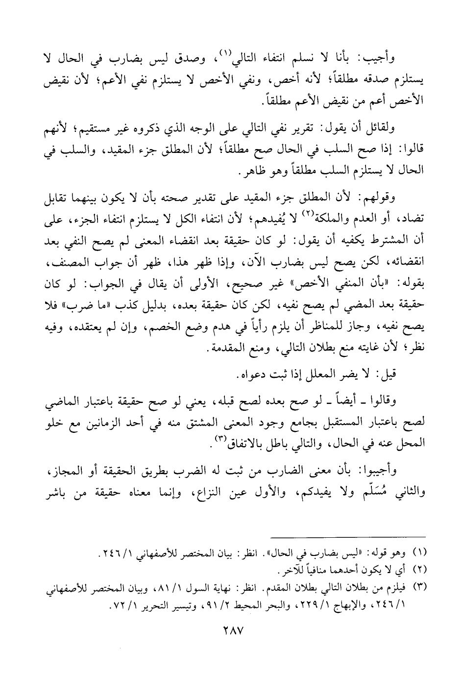 ولقائل أن يقول: تقرير نفي التالي على الوجه الذي ذكروه غير مستقيم؛ لأنهم قالوا: إذا صح السلب في الحال صح مطلقاً؛ لأن المطلق جزء المقيد، والسلب في الحال لا يستلزم السلب مطلقاً وهو ظاهر.