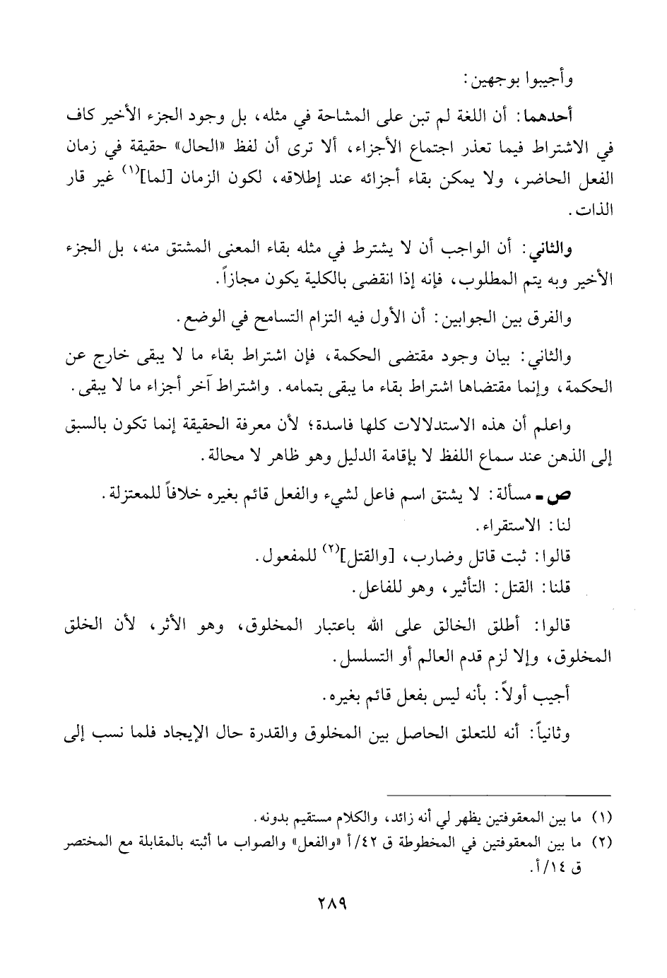 ص ــ مسألة: لا يشتق اسم فاعل لشيء والفعل قائم بغيره خلافاً للمعتزلة.