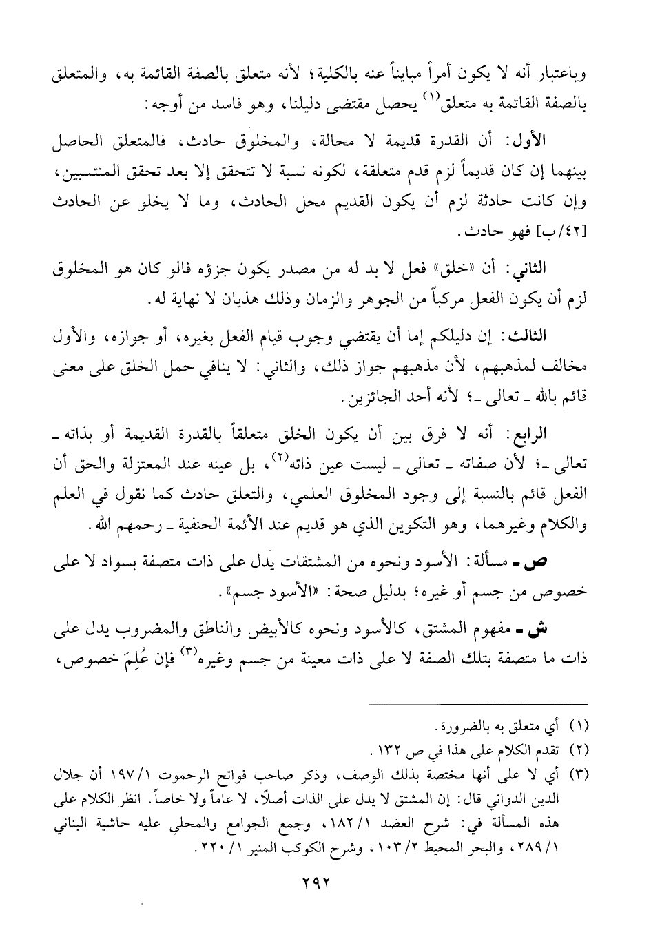 الرابع: أنه لا فرق بين أن يكون الخلق متعلقاً بالقدرة القديمة أو بذاته ــ تعالى ــ؛ لأن صفاته ــ تعالى ــ ليست عين ذاته، بل عينه عند المعتزلة والحق أن الفعل قائم بالنسبة إلى وجود المخلوق العلمي، والتعلق حادث كما نقول في العلم والكلام وغيرهما، وهو التكوين الذي هو قديم عند الأئمة الحنفية ــ رحمهم الله.