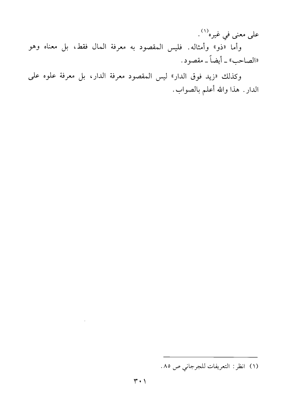 وكذلك "زيد فوق الدار" ليس المقصود معرفة الدار، بل معرفة علوه على الدار. هذا والله أعلم بالصواب.