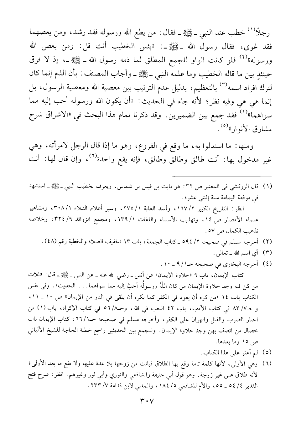 رجلاً خطب عند النبي -صل الله عليه وسلم- فقال: من يطع الله ورسوله فقد رشد، ومن يعصهما فقد غوى، فقال رسول الله -صل الله عليه وسلم-: (بئس الخطيب أنت قل: ومن يعص الله ورسوله) فلو كانت الواو للجمع المطلق لما ذمه رسول الله -صل الله عليه وسلم-، إذ لا فرق حينئذ بين ما قاله الخطيب وما علمه النبي - صل الله عليه وسلم- وأجاب المصنف: بأن الذم إنما كان لترك افراد اسمه بالتعظيم، بدليل عدم الترتيب بين معصية الله ومعصية الرسول، بل إنما هي هي وفيه نظر؛ لأنه جاء في الحديث: (أن يكون الله ورسوله أحب إليه مما سواهما) فقد جمع بين الضميرين. وقد ذكرنا تمام هذا البحث في (الإشراق شرح مشارق الأنوار).
