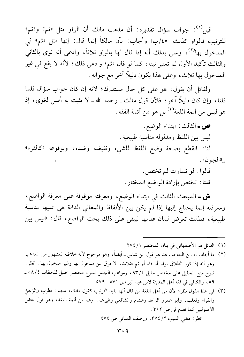 قيل: جواب سؤال تقديره: أن مذهب مالك أن الواو مثل (ثم) و (ثم) للترتيب فالواو كذلك (٤٥/ب) وأجاب: بأن مالكا إنما قال: إنها مثل (ثم) في المدخول بها، وعني بذلك أنه إذا قال لها بالواو ثلاثا، وادعي أنه نوى بالثاني والثالث تأكيد الأول لم تعتبر نيته، كما لو قال (ثم) وادعي ذلك؛ لأنه لا يقع في غير المدخول بها ثلاث، وعلى هذا يكون دليلا آخر مع جوابه.