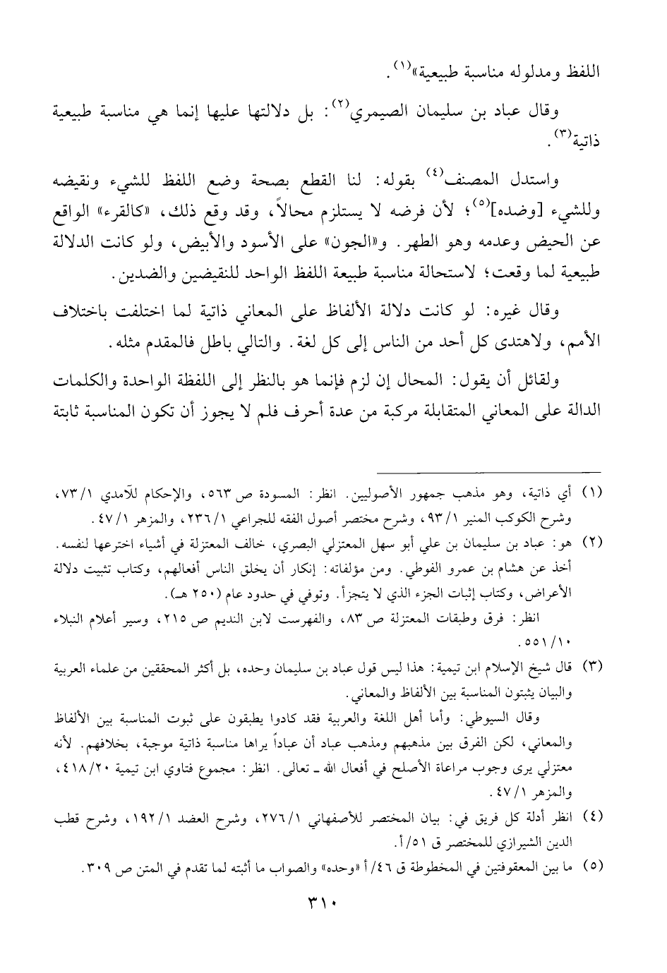 وقال عباد بن سليمان الصميري: بل دلالتها عليها إنما هي مناسبة طبيعية ذاتية.